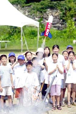 ハンファ(韓化)グループが27日、ヤンピョン・ハンファコンドミニアムで開催した「第1回2000夏、宇宙へとアカデミー」で、学生等が自分達が組み立てたロケットの発射場面を眺めている。