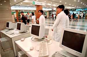 3日、ソウル大病院の医者らが案内員もいなくて、近隣の薬局を案内するコンピューターの電源まで切れている医薬分業案内センターの前を無頓着に通り過ぎている。