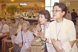 15日、ソウルオリンピックパークテルで北側訪問団の金浦(キンポ)空港到着場面をTVを通じて眺めていたキム・スックべ(右)、キム・ヨンべ(右から2番目)姉妹が、姉であるキム・オクべさんを確認しては笑みを隠せずにいる。