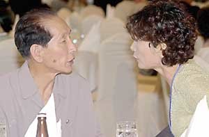 17日、ソウル・ウォーカーヒルホテルで開かれた家族同伴の午餐会で、ある離散家族がお互いをまじまじ見つめながら短かかった出会いを名残惜しんでいる。