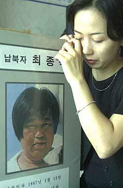 87年に北朝鮮に拉致されたドンジン丸の漁船長チェ・ジョンソクさんの娘ウヨンさんが、今回離散家族相互訪問の際、北側の人達に見せて父親の生死確認をお願いしようと作ったパネルを見てすすり泣いている。