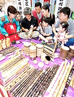韓国観光公社が主管する、全国観光記念品公募展入賞作展示会に訪れた観覧客たちがタンヤン(潭陽)の竹細工工芸品の製作過程を見学している。5日までソウルのサムソン(三成)洞COEX新館で開かれているこの行事には全国16ヶ所からの出展作と北朝鮮の作品116点が展示されている。
