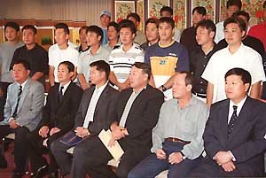 シドニーオリンピックの野球代表チームが4日、ソウルタワーホテルに初めて集まり、顔合わせをした後、記念撮影をしている。