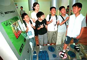 6日(水)、ある企業が国立ソウル科学館内に誰でも楽しめる通信科学館をオープンさせた。通信科学館を訪れた子どもたちが携帯電話型の大型ゲームで遊んでいる。