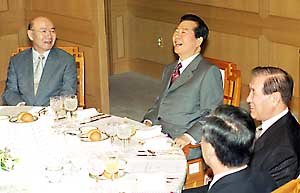 金大中(キン・デジュン)大統領が15日、ゼン・ドゥファン(全斗煥)、ノ・テウ(盧泰愚)元大統領と3部要人を青瓦台(大統領邸)に招待し、午餐を共にしながら破顔一笑している。