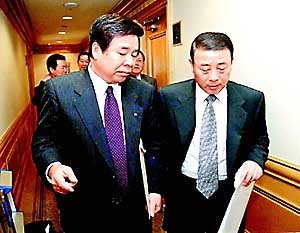 18日、ソウル明洞(ミョンドン)の銀行会館で開かれた大宇グループの債権団会議後、頭取らが深刻な表情で会議室を出てきている。