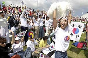 23日に行われた野球は韓国対日本のライバル対決となったが、試合が行われている間、外野席である芝生をぎっしりと詰めた韓国の応援団が熱狂的な応援を続けている。