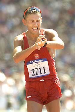 シドニー五輪で29日に行なわれた競歩男子50kmで金メダルを獲得したコルジェニオフスキー選手。ゴールの後、腕時計で自分の記録を確認している。