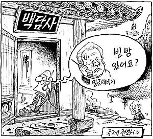 百潭(ペクタム)寺のお坊さんが電話で話している。百潭寺は、全斗煥(チョン・トゥファン)元大統領(右側)が退任後、篭っていたところである。