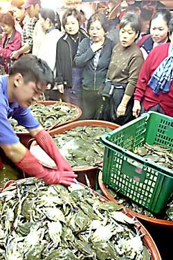 15日仁川(インチョン)市のソレポ港を訪れた秋の行楽客が、市場で旬のワタリガニを買うために、並んで待っている。