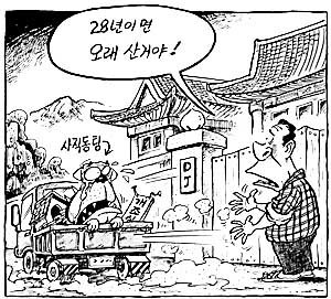 金大統領(青瓦台《大統領邸》の前に立ち):28年とは、だいぶもったもんだ!