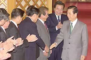 16日(月)、青瓦台(大統領府)国務会議に先立ち、国務委員らが拍手で金大中(キム・テジュン)大統領のノーベル賞受賞を祝った。