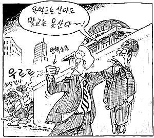 ハンナラ党(中央):検察総長の胸ぐらを掴んで、拳をぐっと握り締めている。
