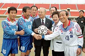 民主党のソ・ヨンフン(徐英勳)代表が22日(日曜日)、ソウルの木洞(モクドン)サッカー場で開かれた第4回ソウル-平壌OB対抗親善サッカー大会を訪問、選手達を激励している。