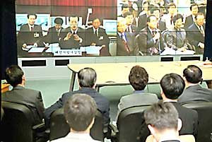 23日、国会の科学技術情報通信委員会の委員らが、気象庁に設置された大型のマルチビジョンのモニターを通じて地方気象庁に対する「サイバー国監」を実施している。