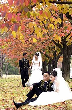 京畿(キョンギ)道竜仁(ヨンイン)郡湖巖(ホアム)美術館の近くにある色鮮やかな秋の森を散策し、記念撮影を行なう新郎・新婦たち。
