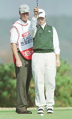 パク・セリ(右)と彼女のスイングコーチであり、今大会ではキャディーバックまで背に負ったトム・クリービがグリーンに上がり慎重な目つきでパッティングラインを読んでいる。