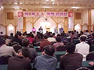 アルコール中毒患者たちがお互いの悩みを打ち明け、治療と社会復帰の糸口を模索するAA(アルコール中毒患者の集い)国際コンベンションが金曜日から日曜日まで、全羅(チョルラ)北道茂朱(ムジュ)郡の茂朱リゾートで開かれた。この集まりには「ソウル在住ミスター金」、「プサン在住ミス李」とだけ明かした全国のアルコール中毒患者300名余りとその家族、そして日本、アメリカから来た50名余りの会員、精神科医師と社会福祉に携わる者など全部で400名余りが出席した。今回のコンベンションでは、アルコール中毒により家庭と人格破綻の事例を告白するマラソントークと、5年以上酒を止めているベテラン会員たちの事例を発表するスピーカーズミーティング、専門家の意見、親睦行事など多様なプログラムを行われた。