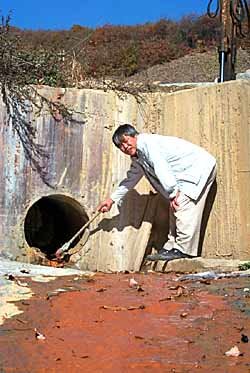 「オポ、モヒョンの納骨墓 反対住民対策委」の副委員長が、城南公園の中で大量に埋め立てられた各種ゴミから流れる真っ赤な垂れ水を指差している。