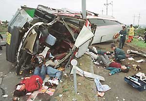 8日午前、済州(チェジュ)道北済州郡の迂回道路で事故を起こした観光バスが、まるで紙くずのようになってしまった。車内からはじき飛ばされた観光客らが、意識を失ったままあちこちで倒れている。