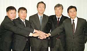 ジョン・モンジュン(鄭夢準)大韓サッカー協会長をはじめ、歴代のワールドカップサッカー代表チームの監督らが懇談会を終えた後、手に手を取りながら団結した姿を見せている。