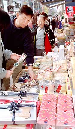 修学能力試験(日本のセンター試験のようなもの)を5日後に控えた10日(金)、ソウル市新村(シンチョン)のあるギフトショップを訪れた外国人らが、‘合格祈願商品’を不思議そうに眺めている。