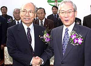 ハンナラ党の李會昌(イ・フェチャン)総裁(右側)と民主党の徐英勲(ソ・ヨンフン)代表が11日、農村振興庁の運動場で開かれた韓国農村指導者大会に参席し、握手している。