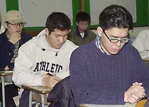 大学修学能力試験(日本のセンター試験)が実施された15日、問題用紙を受け取った受験生らが、注意深く名前と受験番号を記録した後、問題に取り掛かった。お祈りを捧げたり、目をいじくる受験生らの表情から緊張感を伺える。