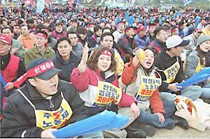 韓国労総所属の組合員3万名余りが19日(日)、ソウル市汝矣島(ヨイド)の漢江(ハンガン)で、全国労働者大会を開き、「労働者の犠牲だけを要求するようなリストラに反対する」と訴えた。
