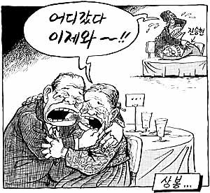 検事(1名、後側のテーブルで、1日午後出頭した陳承鉉(チン・スンヒョン)氏を抱き寄せ、泣いている。離散家族とともに声を上げ):どうしてたんだ、今まで!!