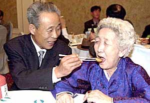 半世紀ぶりに懐かしい肉親と再会し、眠れぬ一夜を過ごした南北離散家族らは1日、宿泊先のソウル市蚕室(チャムシル)にあるロッテワールドホテルと平壌(ピョンヤン)の高麗(コリョ)ホテルで家族単位の個別対面の時間を持ち、再会の喜びを分かち合った。