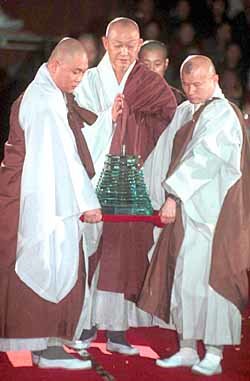 社団法人高麗(コリョ)大蔵経研究所(所長-チョンリム和尚)所属の僧たちが6日、ソウルオリンピック公園フェンシング競技場で‘高麗大蔵経電算化本奉呈式’を行い、大蔵経のCD-ROMを仏前に運んでいる。この日の行事にはキム・ハンギル文化省長官、ソ・ジョンデ曹渓宗総務院長らが参加した。