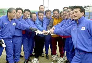 韓日議員連盟サッカー大会に出場する与野議員らが7日、ソウル東大門運動場で、2002年ワールドカップの宣伝とチャリティー募金のための親善大会を始める前に、善戦を誓っている。