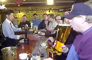 ソウルの梨泰院(イテウォン)洞、ソウルポップの親睦会‘ブーツクラブ’会員らが、長靴の形に作られたジョッキを飲み干しながら、恵まれない人への募金を集めている。