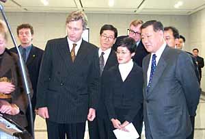 12日、ベルギーのフィリップ皇太子(左から二人目)が、ソウル良才(ヤンジェ)洞にある現代(ヒュンダイ)自動車本社を訪問し、鄭夢九(チョン・モング)現代起亜(キア)自動車会長(右側)と、産業部門の協力強化方案について協議した後、1階の自動車展示場を見学している。