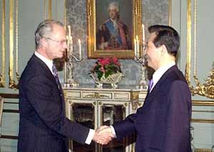 スウェーデンを訪問中の金大中(キム・デジュン)大統領が13日午後、カール・グスタフ16世国王より、午餐の招待を受けてスウェーデン王宮を訪問、国王と挨拶を交わしている。