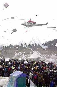 27日(水)午前、京畿(キョンギ)道高陽(コヤン)市にある国民(クッミン)銀行の一山(イルサン)研修院で、出動した警察のヘリコプターが、低空飛行をもって国民・住宅(ジュテック)銀行の労組員の解散を促す一方、スト現場の大型テントとスチールなどが乱れながら飛び散っている。