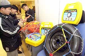 大雪となったソウルのあるデパートの自動車用品コーナーは8日、雪道での安全運転装備を求める人々でごった返した。