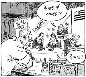コリン・パウエル(コック長)が作った‘朝鮮半島スープ’---‘相互主義’、粉唐辛子、からし等で調理---を金大統領、金正日(キム・ジョンイル)総書記、李會昌(イ・フェチャン)総裁が食べており、その姿を見守っている。両金氏の表情は暗い。