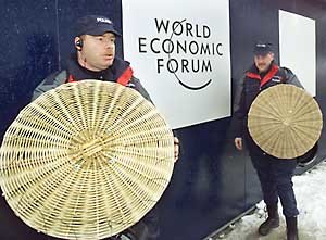スイスにあるダボスのアルペンスキーリゾートで25日、世界経済フォーラム・ダボス会議が開幕した。スイス警察が、反世界化を叫ぶデモ隊を防ぐため、鎮圧用の盾を持って会議場であるダボス・コングレスセンターの周りに立っている。