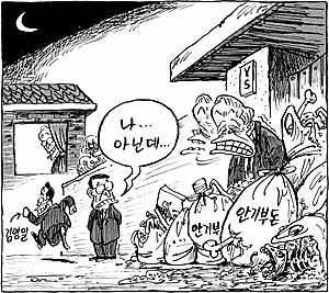 金前大統領(右側)が自家の前に置かれた旧国家安全企画部(安企部・現国家情報院)資金が包まれた幾つもの風呂敷きを凝視している。金・ヨンイル議員(左側で走っている人)は、安企部資金が金前大統領の政治資金である事を明らかにした。