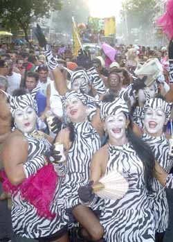 ブラジル リオのカーニバルの開幕を数日前に控えた19日(月曜日)、リオ・デ・ジャネイロの市内で開かれた開幕を知らせるパレードで、絢爛たる衣装を着こなした参加者らが、愉快な踊りを披露している。