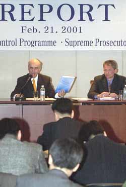 21日(水)午前、プレスセンターで行われた国際麻薬統制委員会(INCB)のソウル会議で、サンドロカルバーニ国連麻薬統制計画(UNDCP)アジア太平洋地域支部長(左側)が、2001年の報告書について説明をしている。