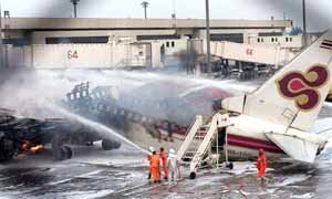 タイのタクシン首相が搭乗予定だった飛行機が3日、バンコク国際航空滑走路で爆発し、消防隊員らが消火活動を行っている。