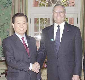 金大中(キム・デジュン)大統領が7日夜(韓国時間)、ホワイトハウスの迎賓館で、コリン・パウエル米国務相との朝食会に先立ち握手を交わしている。