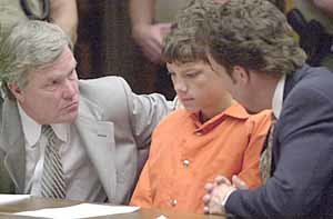 米国、カリフォルニア州南部サンタナ高校拳銃乱射事件の容疑者チャールズ・アンドリュー・ウィリアムズ(中央)が7日、サンディエゴ・カウンティー法廷において、弁護士達と会話を交している。この事件発生後2日目に当たる7日ペンシルバニア州ウィリアムズポートのローマカトリック系の学校においても、拳銃発射事件が発生し、米国社会に衝撃を与えた。