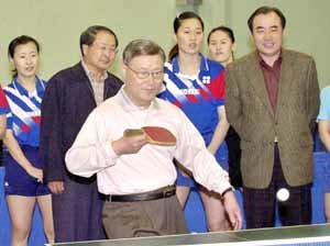 民主党の金重權(キム・ジュングォン)代表は8日、泰陵(テヌン)選手村を訪問、日本大阪世界卓球選手権大会に参加する韓国選手団を激励した後、選手と共に卓球を楽しんでいる。