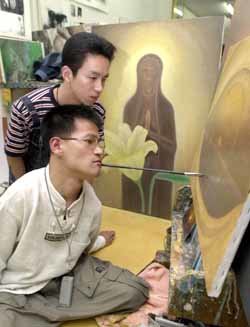 肢体障害1級の障害者でありながら学生のホ・ファンさんが、寄宿舎のルームメートである先輩チェ・ジョンウさんが見守る中、作業室で口を利用して絵を描いている。