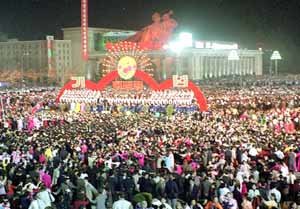 朝鮮民主主義人民共和国(北朝鮮)の故金日成(キム・イルソン)主席の89回めの誕生日である15日(日)、金日成広場で開かれた祝賀夜会の行事に平壌(ピョンヤン)市民10万名が参加し、踊りをおどっている。