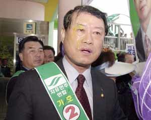 民主党の朴尚奎(パク・サンギュ)事務総長が19日、論山(ノンサン)市長選挙に出馬した連合公薦の候補(自民連)の支援遊説の途中、民主党の公薦で落ちた候補の支持者に卵を投げつけられた。